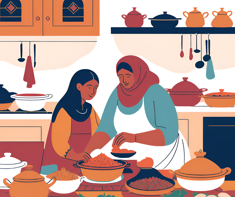 Daarnaast besteedden de vrouwen veel tijd aan voeding. Ze vertelden dat ze vaak instonden voor de voorbereiding en het koken van eten, al dan niet met hun moeder. Zo stonden Hakima en Naual hun moeders bij het dagelijkse kookwerk bij, terwijl in de huishoudens van Souad en Hafsa koken volledig hun verantwoordelijkheid was. Opdienen en de opkuis na het eten was een taak voor alle vrouwen.43 Omdat de families van de vrouwen deel uitmaakten van de pioniers, waren er nog geen bakkers of slagers die Marokkaans brood of halalvlees aanboden. Ze moesten het brood dus zelf bakken, omdat veel Marokkaanse gerechten worden gegeten met Marokkaans brood. Die taak is niet te onderschatten. Zo getuigt Hakima over de tijd dat zij brood leerde maken.