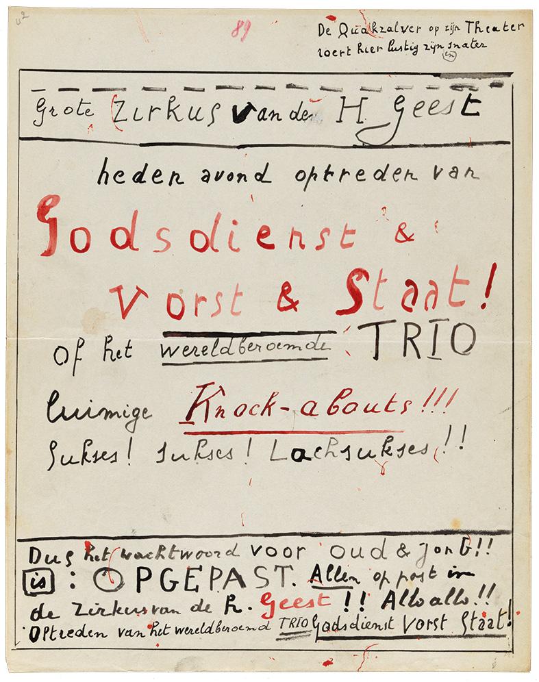 Het optreden van het trio Godsdienst & Vorst & Staat in het ‘Grote Zirkus van den H. Geest’. Bladzijde uit het integrale manuscript van Bezette Stad dat in 2021 door de Vlaamse Gemeenschap werd aangekocht voor 725.000 euro.