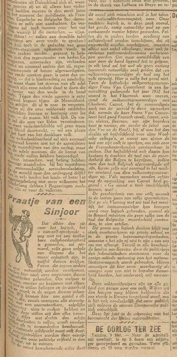 Het ‘Praatje van een Sinjoor’ ging politieke analyse niet altijd uit de weg. Op 11 mei 1917 is het thema bijvoorbeeld ‘het levensrecht der kleine nationaliteiten’. Deze bijdrage werd niet ondertekend, maar kan vermoedelijk eveneens worden toegeschreven aan Van Ostaijen.
