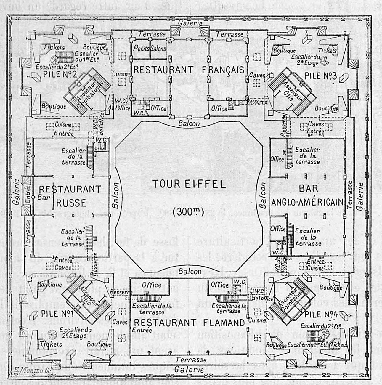 Plan van het eerste platform van de Eifeltoren tijdens de wereldtentoonstelling van 1889: in de richting van het Trocadero was het restaurant Flamand gevestigd (onderaan), naast het Bar Anglo-Américain en het Restaurant Russe en tegenover het Restaurant Français. [Revue des Sciences, jg. 17, 1889, nr. 1, p. 399]